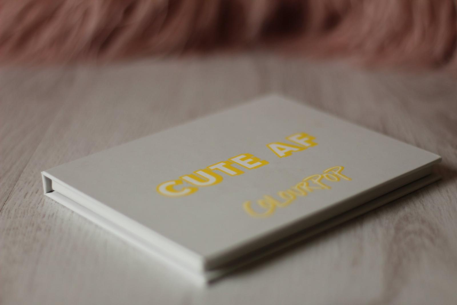 The lid has CUTE AF written across it in bright white 3D lettering outlined in bright yellow (not sure why, given that the palette is called Yes Please!).